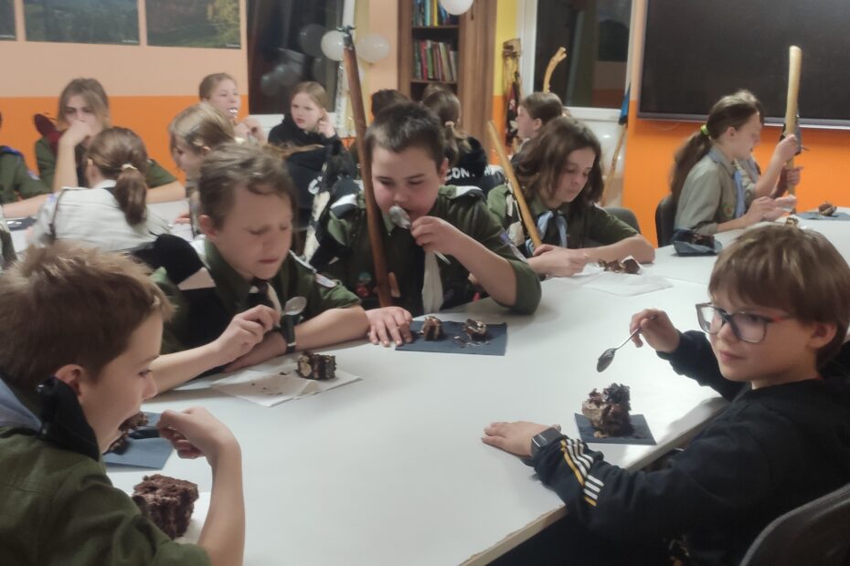 Po grze udaliśmy się na kolację. Po posiłku przyszedł czas na świętowanie kolejnej rocznicy naszej drużyny, mianowicie 34-lecia. Niespodzianką dla wszystkich okazał się przygotowany tort (przed druhnę Agnieszkę – byłą drużynową 89 JGZ Wesołe Krasnale, za co bardzo dziękujemy!) i quiz dotyczący Contrastu – zarówno jego historii, jak i zabawnych pytań o kadrę. Po obchodach przyszedł czas na świecznisko, na którym każdy podzielił się powodem, dla którego był/jest w Contraście. Po świecznisku przebraliśmy się w piżamy, umyliśmy zęby i poszliśmy spać, żeby nabrać sił na kolejny dzień wędrowania.